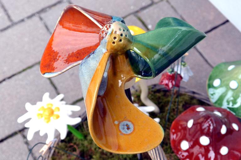 Mo, Di, Do, Fr. 14.30 bis 17 Uhr,Keramikwindrad auf Stiel aus EU-Fertigung. Jedes Stück einzigartig. Keines gleicht einem anderen - Handarbeit eben.